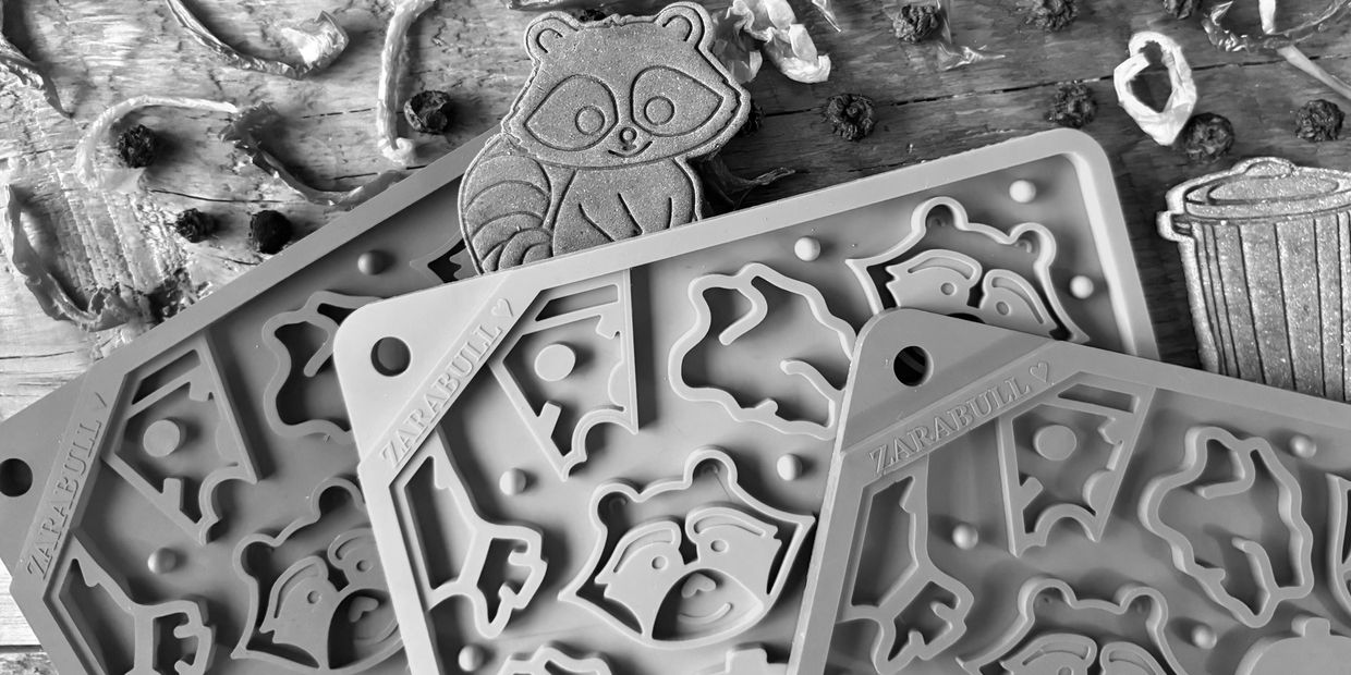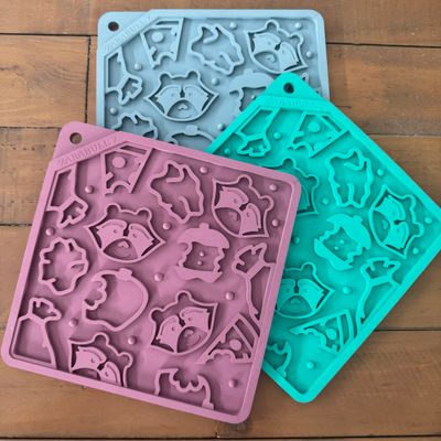 This mat has large open sections as well as smaller fillable sections which are more difficult to lick contents out of. The mat features raccoon faces, garbage bags, crumpled trash, left over pizza and apples/cores. We have also include a few small “bumps” that provide additional texture in the voids to keep the dogs navigating. We also have our Trash Panda treats which are fun to pair with this mat!